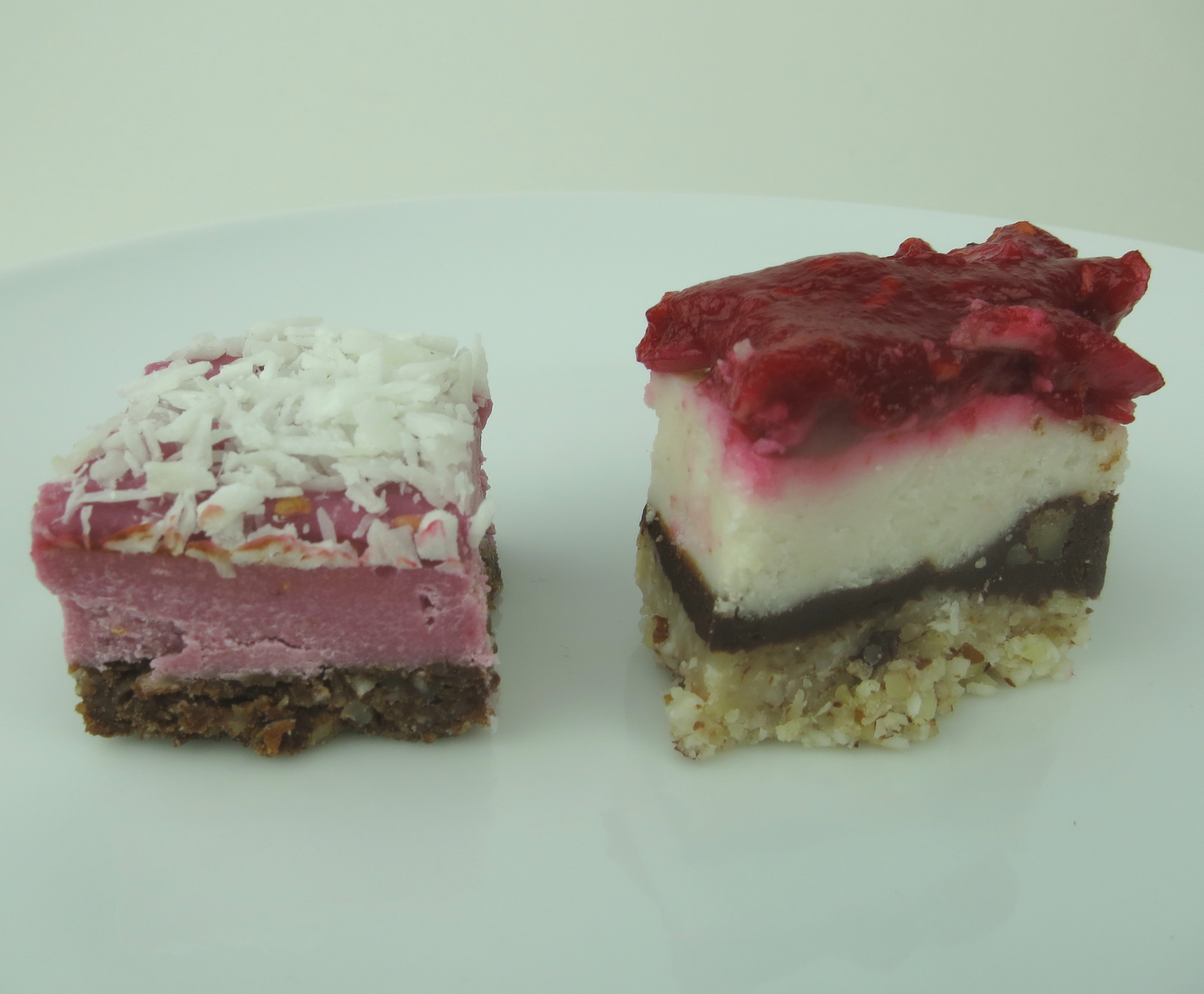 Tests #1 and #2 for Chocolate Raspberry Cheesecake Bars. I wanted a sensually delicious love bar for Valentine’s Day and all year round! My first batch on the left was easy and tasted yummy. The second bar had more layers, was a bit more work, and was worth the effort! Absolutely divine!
